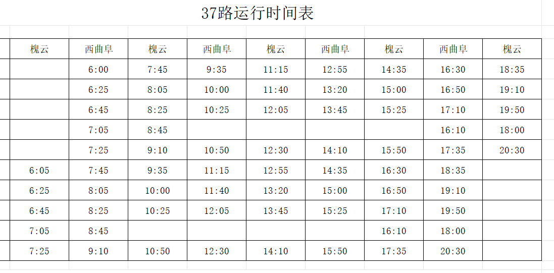調(diào)整后,37路由西曲阜發(fā)車,按原線路運行至威高時光城站點,改行宮松嶺路、遠遙墩路、花園中路、福山路至槐云村站點,取消威高花園1個站點,增設(shè)威高醫(yī)院、欽村小學(xué)、西欽村、體育場北、槐云村5個站點。